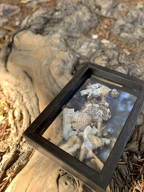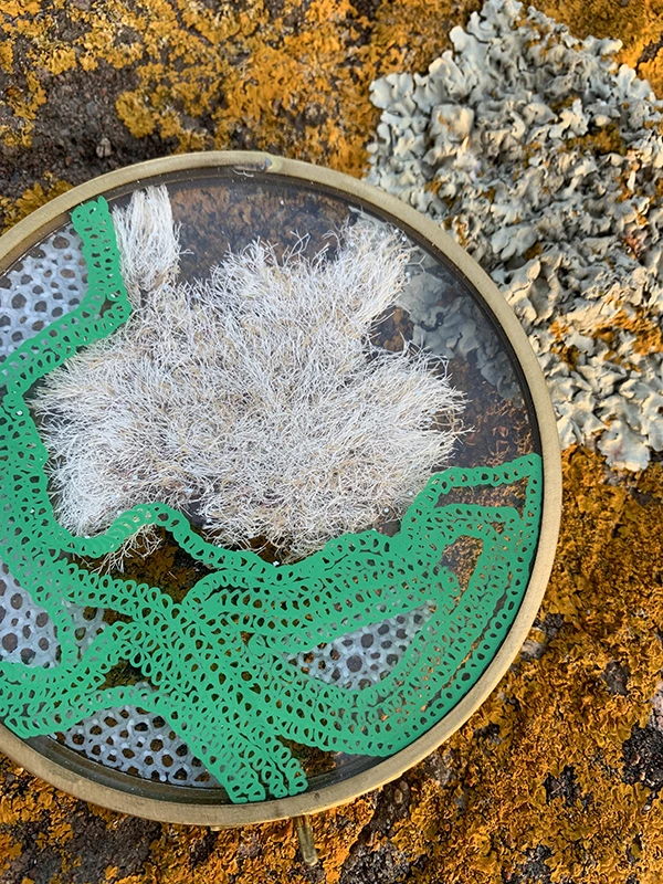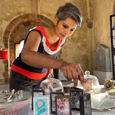 The mixed media artworks find semblance with the microscopic structures of certain endangered species of plant and coral life of the Mediterranean. The work uses materials that are both natural and manmade lending a direct reflection to what the oceans offer. The arrangement of burnt paper, intertwined ribbon, pen work, alongside natural elements from the sea create little microcosms. Some material (such as kite paper) will naturally bleach over time commenting on the bleached coral reefs along the coast. Day to day objects that we take for granted, placed under perspex and cloches like specimens for closer clinical examination turn mundane into precious objects, some soon to be extinct. Emergence of new formations that juxtapose two worlds becomes the norm of the day.