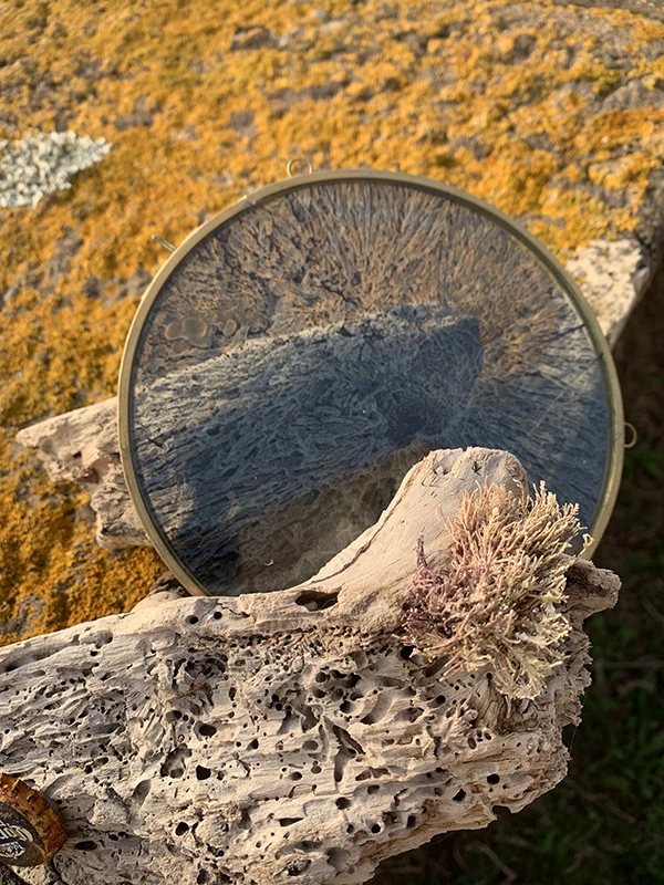 The body of work titled ‘Relics’ explores through mediums and textures elements of the sea, partly viewed at a microscopic level. Washed up objects such as broken glass, corks, bottle caps and metal bits find their place next to driftwood, sea shells and sponges, serving as a gentle reminder of what our seas look like today.